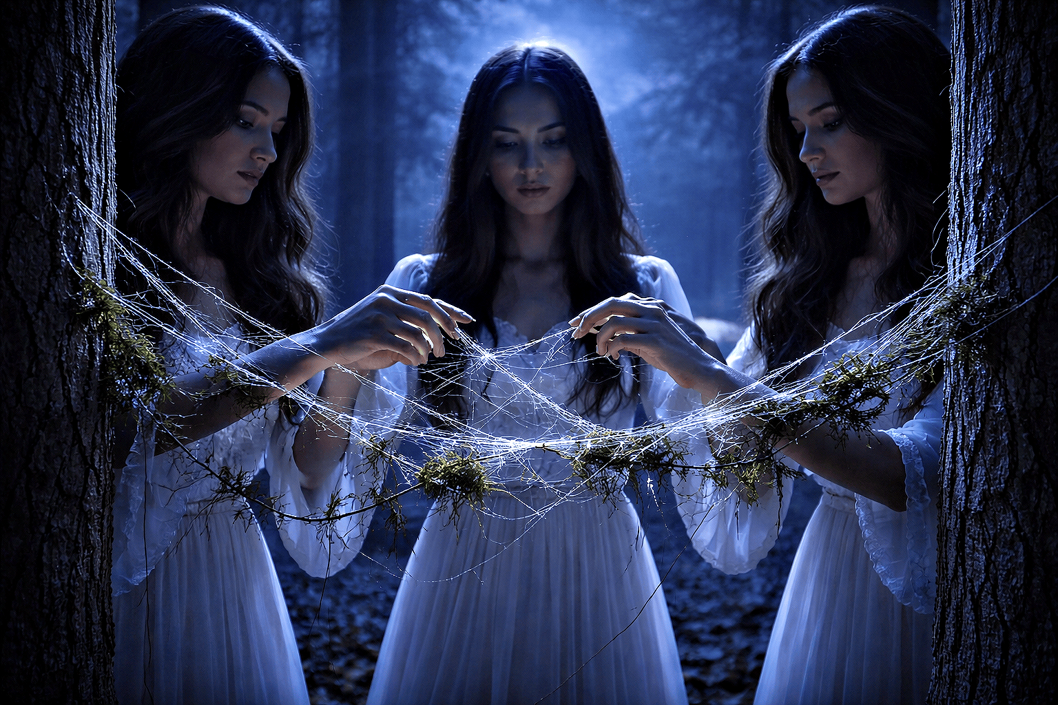 Du trenger tre tydelige punkter rundt deg for å definere ritualets hellige sirkel. Dette kan være tre trær i en skog, tre tente lys i et mørkt rom, eller bare tre enkle gjenstander du plasserer på gulvet for å markere et triangel. Mellom disse punktene ser du for deg fine, nesten usynlige tråder som spennes opp. Ikke se for deg tunge tau eller jernlenker, men noe sart og spindelvev-aktig som flyter i luften. Dette representerer dine ubevisste forbindelser, gamle minner som nekter å falme, uavklarte relasjoner, eller versjoner av deg selv som du har vokst fra, men som fortsatt krever din energi. Forberedelsen er en symbolsk handling for å avgrense et sted der du kan være helt uforstyrret i din prosess.